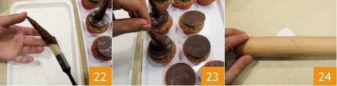 When the muffins have cooled, place a small amount of the reserved melted chocolate in the center of each muffin to ensure the base of the hat adheres well 19; then place the chocolate disk you made earlier: it will be the brim of the hat 20. If, during the hat-making process, the melted chocolate tends to solidify, melt it again in the microwave for a few seconds. With a knife, cut the tips off the wafer cones: these will be used to make the top part of the hats 21;
