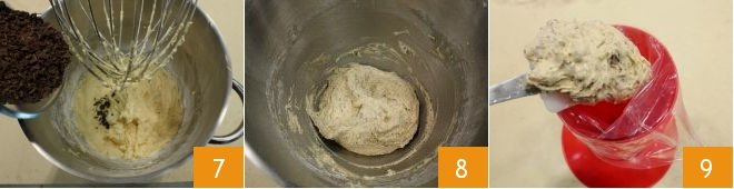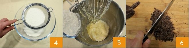 Sift the flour together with the baking powder 4 and add it to the mixture little by little 5; keep the mixer going, in the meantime finely chop the dark chocolate with a knife 6