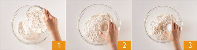 To prepare the wool roll bread, first make the dough. Pour the two types of flour into a bowl 1, add the dry yeast 2, and the sugar 3.