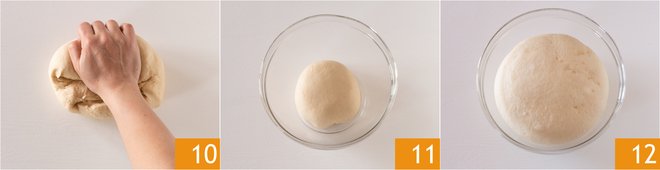 When you have a smooth dough, transfer it to a countertop and knead it with your hands 10 until it becomes smooth. Shape the dough into a ball and transfer it to a bowl 11. Cover with plastic wrap and let it rise in the oven with just the light on for about 2 hours, until the dough has doubled in volume 12.