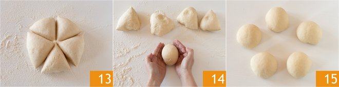 After the resting time, transfer the dough to a lightly floured work surface and divide it into 5 equal pieces 13. Take one of the balls and shape it into a ball again 14. Do the same for the other 4 15.