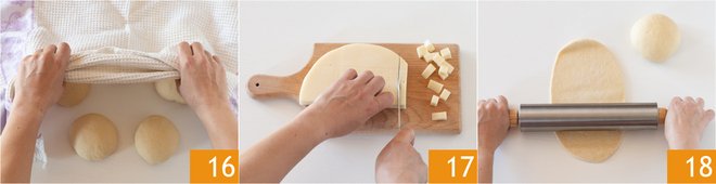 Cover with a kitchen towel 16 and let them rest for another 30 minutes. Meanwhile, cut the provolone into cubes 17. Roll each ball with a rolling pin to obtain an oval 18.