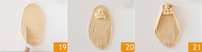 Now make close cuts with a knife or scraper only on the lower half of the oval dough 19. Place the cheese cubes in the center of the upper part 20 and fold the side and top edges over the cheese 21.