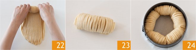 Starting from the top, roll it up 22 to form a small loaf 23. Continue in this way, arranging them inside a 9-inch pan, 2.5 inches high, lined with parchment paper and previously oiled on the edges. Place them next to each other to cover the entire perimeter of the pan 24. Then cover with plastic wrap.