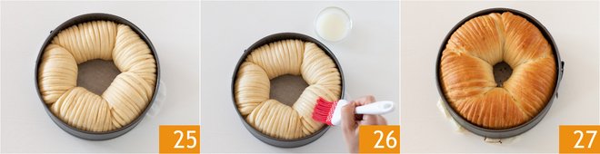 Let rise for another hour in a warm place, until it reaches the height of the pan 25. Brush the surface of the brioche with milk 26 and bake in a preheated static oven at 350°F for about 35-40 minutes. When it is golden brown, remove from the oven 27, wait a few minutes, and serve.