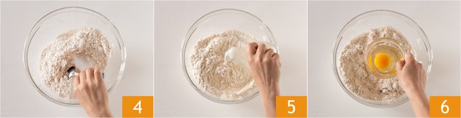 Mix with a spoon 4. Add the milk 5 and mix again. Then pour in the egg 6 and continue to knead, you'll see the mixture start to form.
