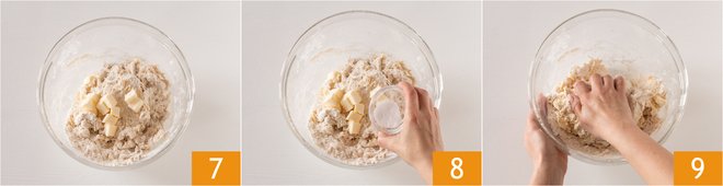 Add the softened butter 7 and the salt 8. Then knead the dough well with your hands 9.