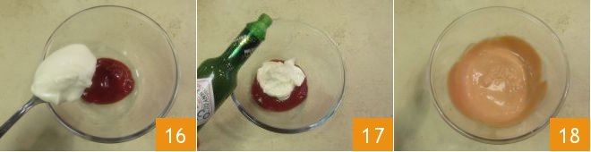 To prepare the dipping sauce, pour the ketchup, mayonnaise 16, and Tabasco sauce 17 into a small bowl, mix well and transfer the sauce obtained 18 into a kitchen squeeze bottle, if you have one.