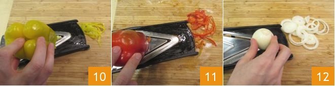 In the meantime, prepare the vegetables: clean and thinly slice the yellow pepper 10, the red pepper 11, and the onions 12 using a mandolin.