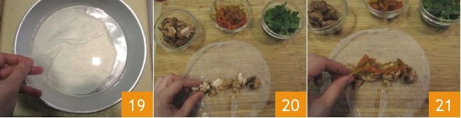 Now you can start assembling the rolls: rehydrate a sheet of rice paper by dipping it in a small amount of room-temperature water for a few seconds 19, then lay it on the work surface. Place the grilled chicken cubes in the central part of the rice paper sheet 20, add the peppers with the onions 21, and a few parsley leaves.
