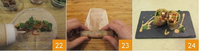 Finally, drizzle with a little sauce 22. Fold the side flaps towards the center and roll up the rice paper sheet to seal the filling inside 23, then cut the roll obtained in half. Repeat the same procedure to form your yakitori rolls and serve immediately 24!