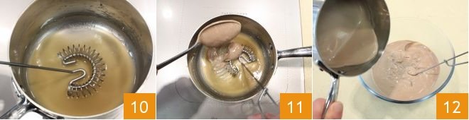 Proceed with the chocolate cream following the same procedure: place a small pot on the stove and heat over low heat 1/4 cup of water, then add 1 teaspoon of agar agar and mix to dissolve it 10, and thicken the mixture over low heat. When it is thick, turn off the heat, temper a tablespoon of the dark cream 11, pour the entire agar agar mixture into the cream 12
