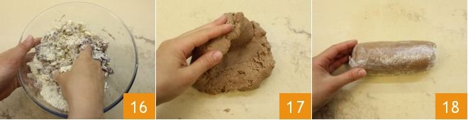 mix by hand to gather all the ingredients 16. Once you have obtained a compact dough, transfer it onto a floured surface 17, shape it into a block, cover it with plastic wrap 18, and let it rest in the refrigerator for about 30 minutes, until firm.