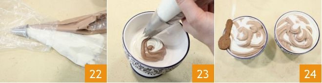 Once the creams have set, you can assemble the dessert: transfer the creams into two pastry bags with star-shaped nozzles 22 and distribute the creams in the serving glasses, alternating them 23, accompany each yogurt and chocolate glass with the spoon-shaped cookies 24.