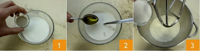 To prepare the yogurt buns with chocolate chips, you can start with the Homemade Yogurt as follows: mix the plain yogurt with 500 ml of fresh whole milk at room temperature, pour into a large bowl, cover with microwave-safe plastic wrap and place the container inside the Smart Oven by setting the automatic fermentation program 2-2 (max weight 500 g). To set the automatic fermentation function just press the corresponding button twice. Once ready, leave it to rest in the fridge for at least 6 hours. In the meantime, proceed to prepare the buns: put the chocolate chips in the freezer for about 1 hour; in the meantime, dissolve the dry yeast in lukewarm milk (whole or semi-skimmed) 1, then pour in 1 teaspoon of honey 2 and mix. Meanwhile, in the bowl of a stand mixer, pour the flour (alternatively to Manitoba flour you can use type 0 flour) and sugar 3, then also add the milk in which you dissolved the yeast and honey.