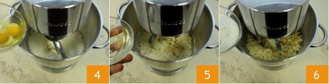 Then pour in the eggs 4 and start working the ingredients with the paddle attachment (if you don't have a stand mixer you can use an electric hand mixer). Also slowly add the oil 5 and when it is absorbed pour in the yogurt 6.