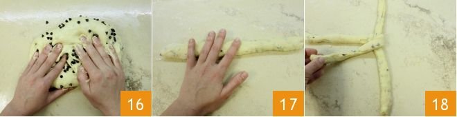 Transfer the dough to a lightly floured surface 16. Cut the dough into 12 lengths of about 12-14 inches each 17 and start forming the buns this way: place two lengths in a cross, then fold the halves to the right and left 18.