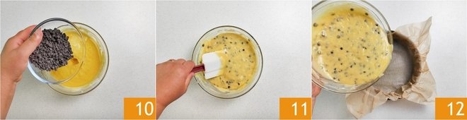 Add the chocolate chips 10 and stir one last time with the spatula 11; just long enough to reach a homogeneous batter. Then pour it into a 9-inch mold lined with parchment paper 12.