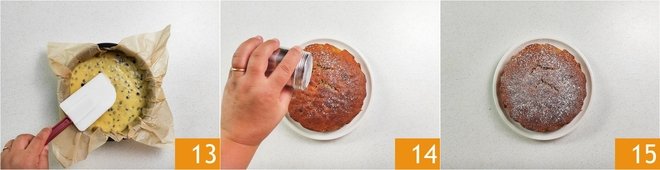 Level the surface well 13 and bake in a preheated static oven at 350°F for 45 minutes. Always do the toothpick test before taking the cake out of the oven. Let the cake cool with the oven door slightly open. Then remove it from the oven, take it out of the mold, and sprinkle with powdered sugar 14 before serving 15.