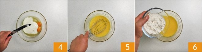 Add the seeds you have scraped from a vanilla pod 4 and beat with a hand whisk 5. As soon as all the ingredients are well combined, add the sifted flour 6.