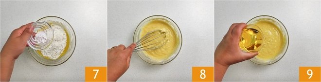 Finally, sift the baking powder and add it to the mixture 7; mix well with a whisk until you get a smooth, lump-free batter; then add the oil 9 and mix well to absorb it.