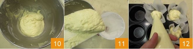 Transfer the batter 10 into a piping bag without a nozzle 11. Now cut out 12 squares of parchment paper measuring 6x6 inches and line a 12-muffin pan with them. Pour the batter until the edge of the mold 12.