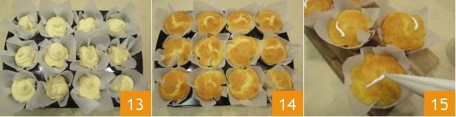 Once all the muffin molds are filled 13, bake in a preheated static oven at 350°F on the lower rack for 30 minutes or until they are golden on the surface 14. Once the yogurt muffins are ready, let them cool slightly before decorating them as desired with yogurt using a piping bag 15 and serving them!