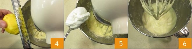 Add a pinch of salt and the grated zest of 1 lemon 4. Finally, pour in the yogurt little by little 5 and continue to mix the batter until it is well combined 6.