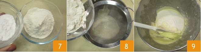 In a bowl, combine the baking powder with the flour 7. Incorporate the sifted dry ingredients into the batter using a sieve 8 and mix with a spatula in a gentle folding motion from bottom to top 9.