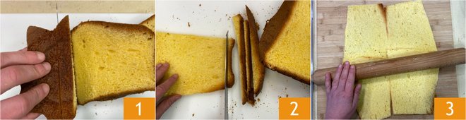 To prepare the Yule log of pandoro, first, cut the pandoro into vertical slices 1 and remove the dark outer part 2. Place the slices on the work surface to form a rectangle and flatten them with a rolling pin to seal them together 3.