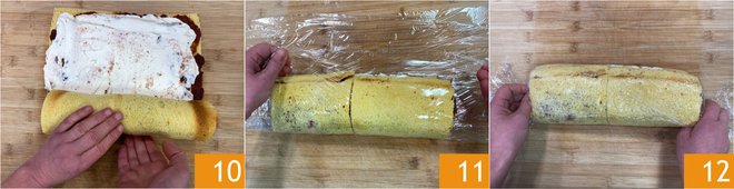 Gently roll up the pandoro base 10, wrap the roll in plastic wrap 11 and twist the ends like a candy 12. Let it rest in the freezer for 3 hours or in the refrigerator overnight.