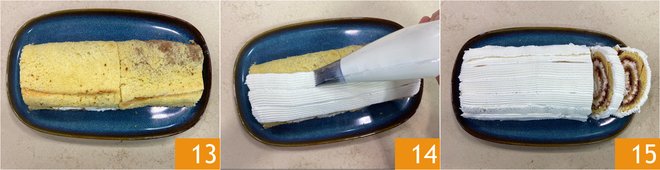 After the resting time, place the Yule log on a serving plate 13 and cover the outside with the remaining cream 14. Your Yule log of pandoro is ready to be served 15!