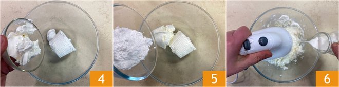 Move on to the cream: in a bowl, put the ricotta, the mascarpone 4, and the powdered sugar 5. Start whipping with an electric beater, then add the cream slowly 6.