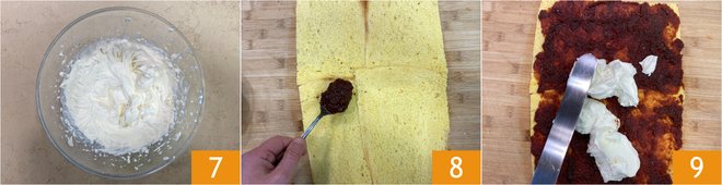 You should obtain a whipped and frothy mixture 7. Spread the base of pandoro with sour cherry jam 8, then add about two-thirds of the ricotta and mascarpone cream, using a spatula to cover the entire surface 9. Transfer the remaining cream to a piping bag with a flat, grooved nozzle and keep it in the fridge until ready to use.