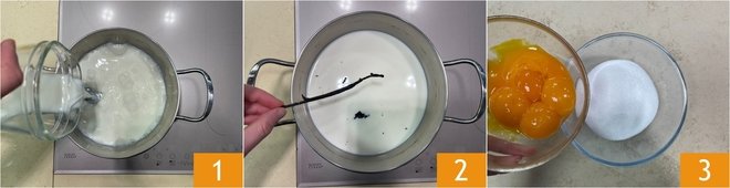 To prepare the zeppole with two creams, start by making the base of the pastry cream: heat the milk in a saucepan 1 and flavor it with the vanilla pod and the extracted seeds 2, let it come to a boil. Meanwhile, in a bowl, pour sugar and egg yolks 3.