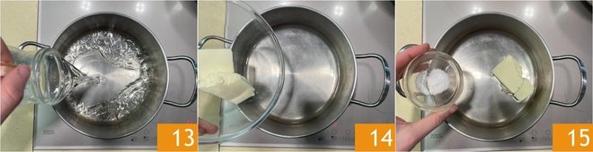 Meanwhile, move on to preparing the zeppole starting with the choux pastry. In a thick-bottomed steel saucepan, pour the water 13, butter 14, and salt 15. Turn on the stove and let it heat up.