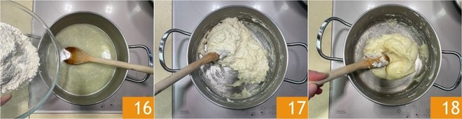 When the butter is melted, pour in the flour in one go 16 and mix immediately with the spoon 17. Cook for 1-2 minutes or until the mixture coats the base and becomes a compact mass 18.