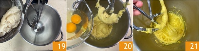 Pour the dough into the mixer 19. If you don't have one, you can use electric beaters, and while activating the paddle, pour one egg at a time 20. Work until the mixture becomes compact and soft 21.