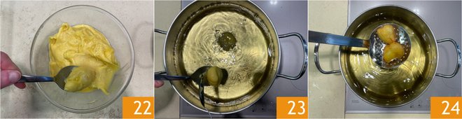 With a spoon dipped in hot oil, take a portion of dough 22 and pour it into the pot where you heated the oil to 320°F 23. This temperature will allow the zeppole to brown on the surface and cook internally in 4-5 minutes 24. Remember to cook a few pieces at a time.