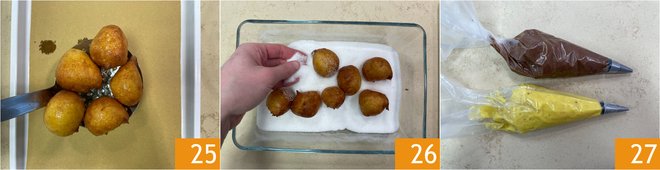 As you go, drain on absorbent paper 25, and when you've finished, obtaining about 30 zeppole, roll in a bowl with sugar 26. The creams should be cold; whisk them vigorously with a whisk before transferring them into two piping bags with a pointed tip to pierce the zeppole 27.