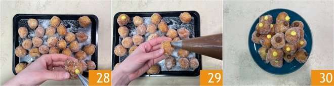 Then proceed by filling one half with the light cream 28 and the other with the dark cream 29. Your zeppole with two creams are ready 30.