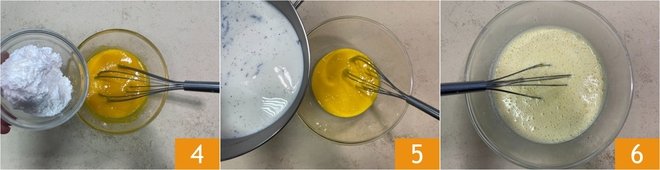Add the cornstarch 4 and mix well. At this point, the milk will be hot; remove the pod and pour it into the bowl 5. Mix well 6.