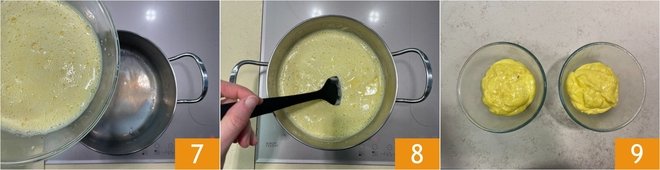 Return the mixture to the saucepan where you heated the milk 7 and thicken the cream by stirring continuously 8. As soon as it reaches the right consistency, divide the creams into two bowls 9.