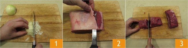 To prepare the Neapolitan ragù, start by peeling and chopping the onion 1. Then trim the beef brisket by removing the fatty part with a sharp blade 2 and cut into pieces 3.