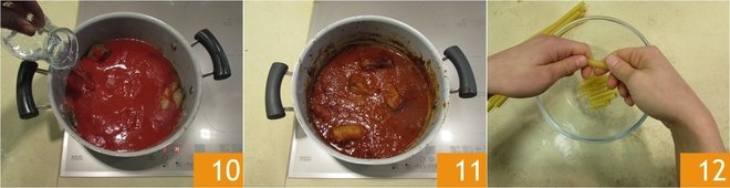 Add the water 10 and a pinch of salt. Cook over low heat, almost simmering, for at least 4 hours 11, then if you prefer, you can shred the brisket and mix it with the sauce. If the water evaporates too much, you can add more as needed. At this point, put a pot of salted water on the stove for the pasta and meanwhile break the ziti 12.
