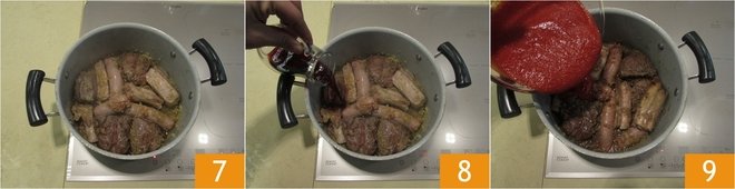 Brown all sides for 6-7 minutes 7. Deglaze with the red wine 8 and, as soon as the alcohol has completely evaporated, pour in the tomato puree 9.