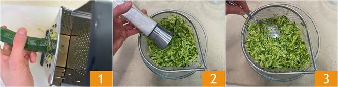 To prepare the zucchini and almond pesto, first wash and trim the zucchini, then grate them using a coarse grater 1. Transfer the zucchini to a colander, salt them 2 and press them down with a spoon. Let the zucchini rest for 20 minutes to remove excess water 3.
