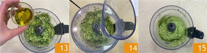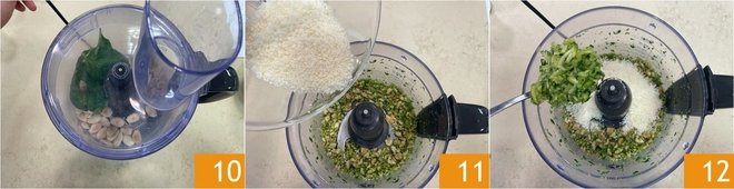 Pulse 10 until you obtain a coarse texture. Now add the grated Parmigiano Reggiano 11 and the drained zucchini 12.