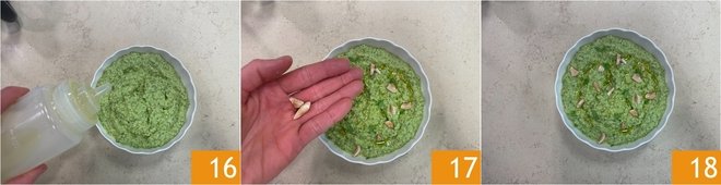 Finish the pesto with a drizzle of extra virgin olive oil 16 and the reserved almonds 17. Your zucchini and almond pesto is ready to be served 18!