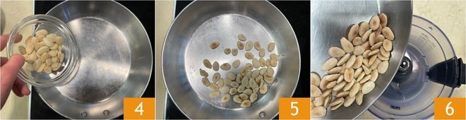 Meanwhile, place the peeled almonds in a hot pan 4 and toast them over medium heat for about 7 minutes, stirring often so they don’t burn 5. Transfer the toasted almonds to a food processor fitted with blades 6, keeping a few aside for decoration.